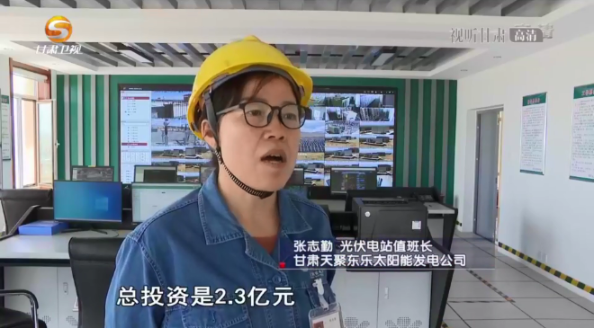 甘肃天聚东乐太阳能发电公司光伏电站值班长 张志勤:“总投资是2.3亿元,2021年2月19日正式并网发电,总装机容量是49.5兆瓦,每年平均上网电量是7000万千瓦时以上,为电网提供了大量的清洁能源,截至今日,发电量是3600万千瓦时,每日发电量是30万千瓦时。”