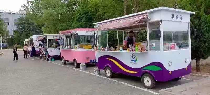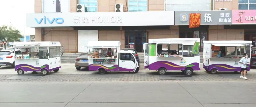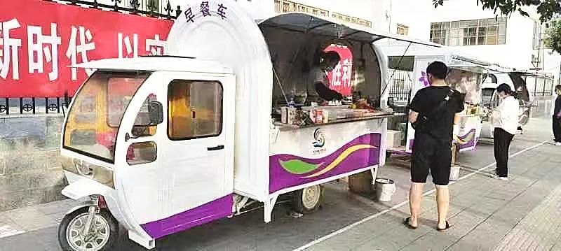 近日,记者在市区上海路恒昌国际小区东门口附近看到,4辆早餐车依次在路口非机动车道两边划定好的区域内整齐地停放着,装饰一新的餐车格外吸引眼球,摊主们正忙碌着为前来购买早餐的市民准备美食。