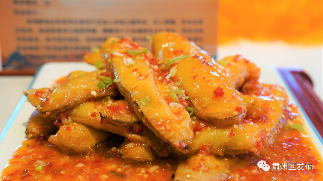肃州熏鱼的主要原料是本地生草鱼,把腌制好的鱼片落锅炸酥,加入排骨酱、叉烧酱、番茄沙司等调味品和炸制好的鱼片,慢慢收汁即可。菜品汁液浓厚,鱼肉鲜甜,是一道地道的养生佳肴。