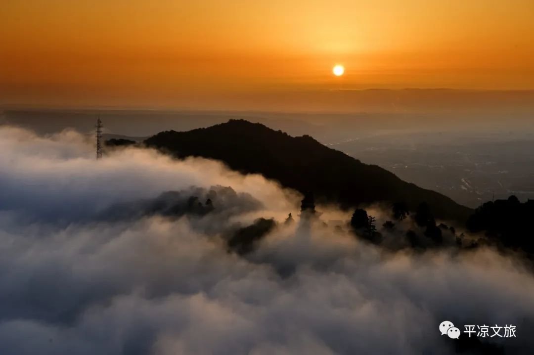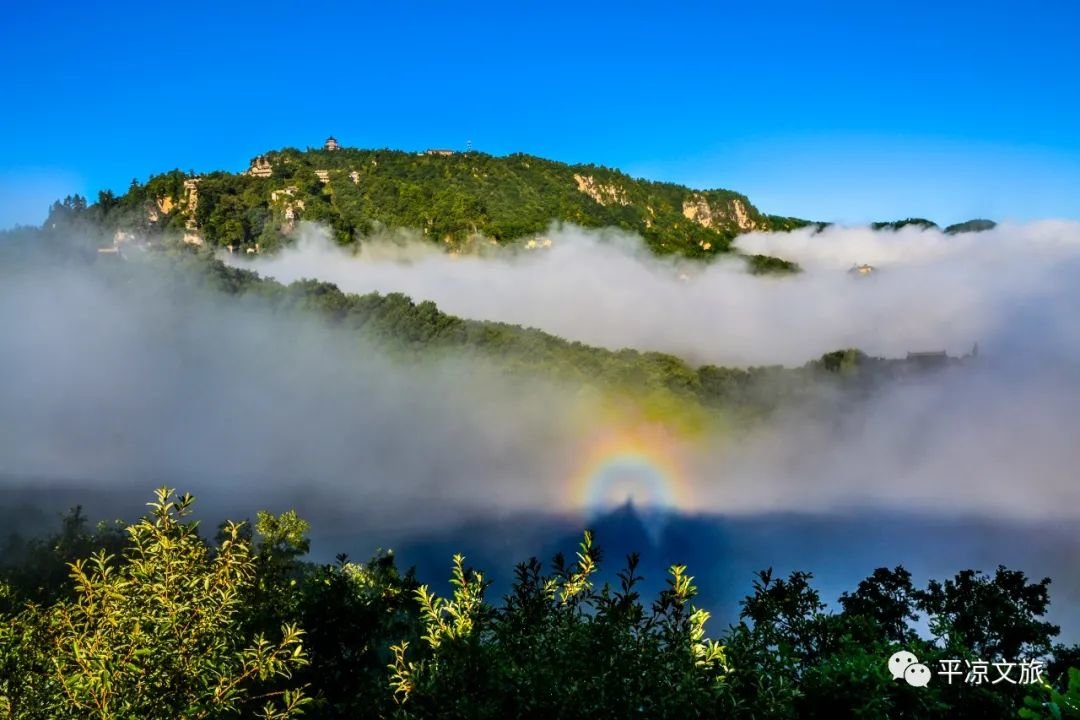 行与山巅,可西望六盘、崆峒,南眺关山,北阅"五指原",俯视平凉川。夏日雨后放晴,有云雾蓬勃蒸腾而起,笼罩山顶,久聚不散,夕阳斜照,光影异彩浮动,蔚为壮观,古称"太统屯云"。十万沟内的黄龙、青龙、白龙、赤龙瀑布呈现阶梯状分布,实为"四面千峰起,中心一水通"。