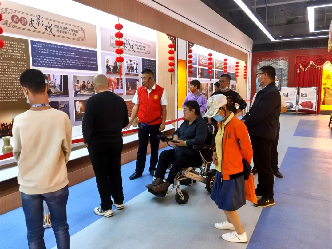 在观看演出前,市文化馆组织参加本次活动的残障人士参观了非遗展厅,市文化馆负责人针对金昌市非物质文化遗产代表性项目的传承情况及生存现状为在场的残障人士进行了详细的讲解。