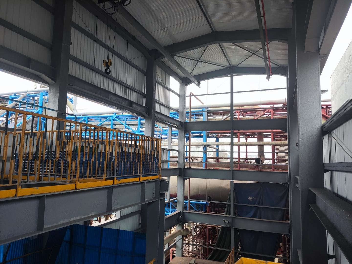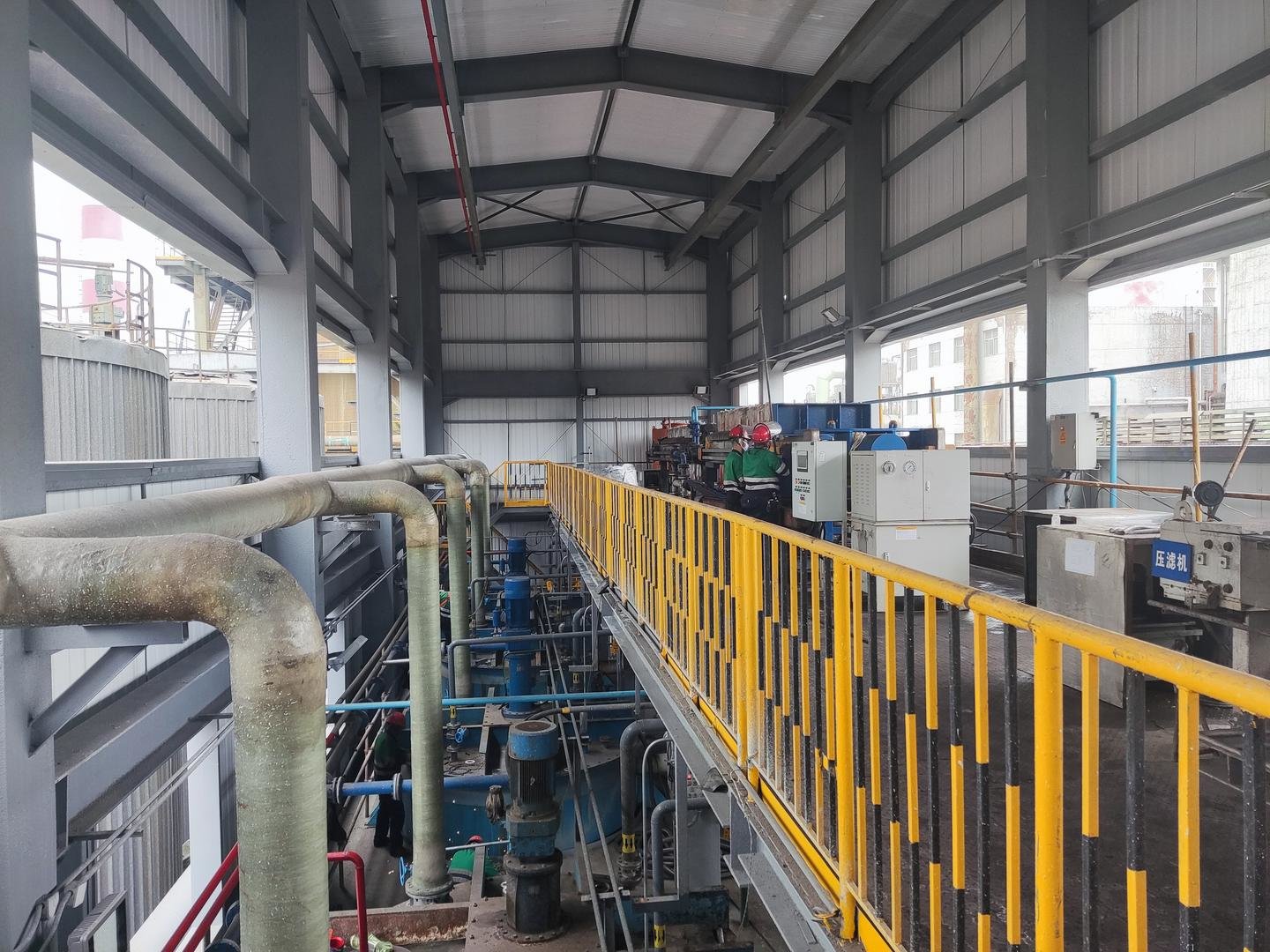 该项目位于环集塔东侧,占地面积492.26m2,新建18.95m高钢结构厂房一座,内部设置三层钢平台,总建筑面积1143.95㎡。于2022年3月15日开始基础施工建设,至7月底完成设备管道安装施工设备单体试车、带水试车,8月初完成专业部室验收,于8月12日投料试生产。从基础开挖到投料试生产,除去天气、假期等影响时间实际耗时130天。