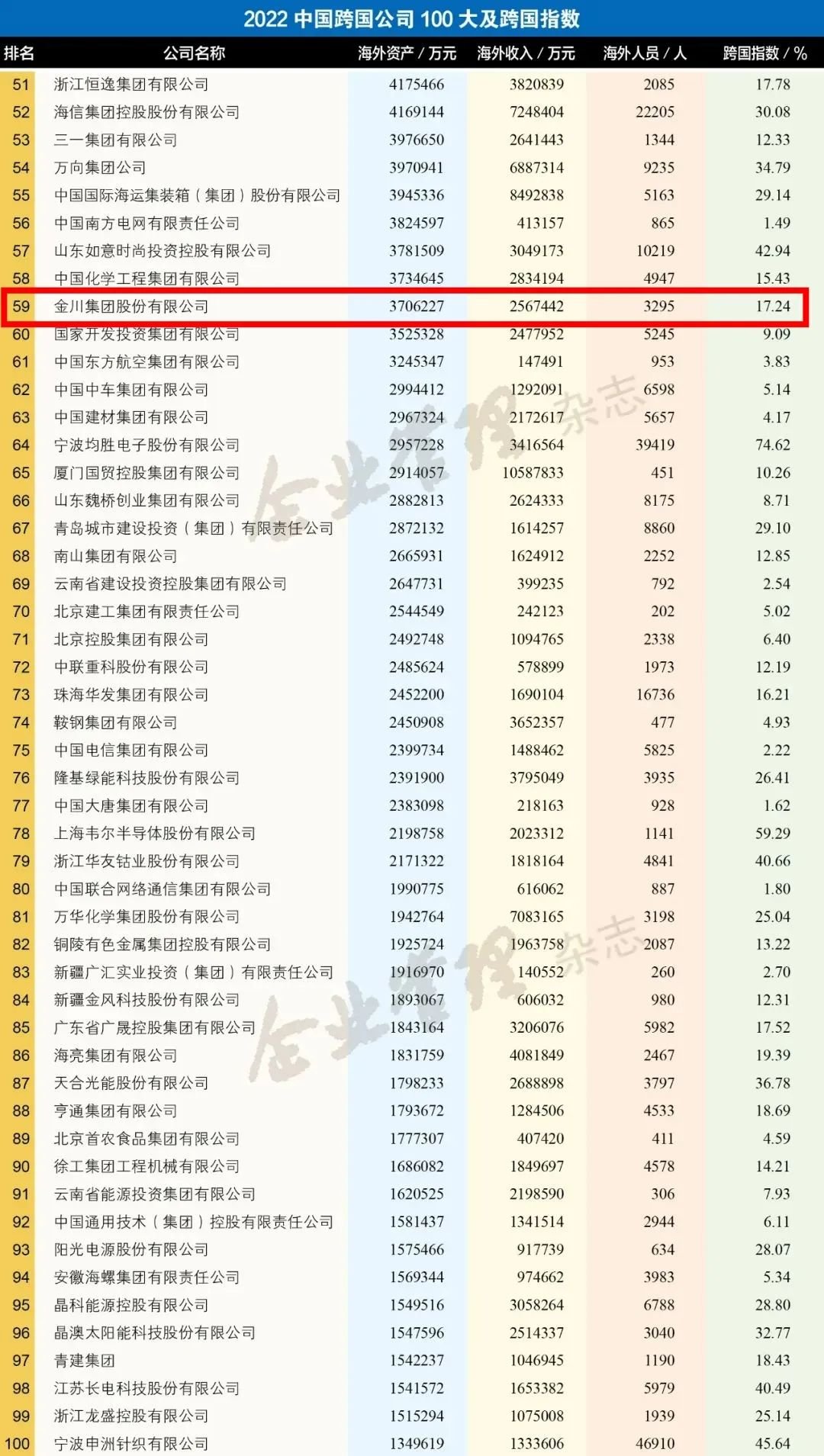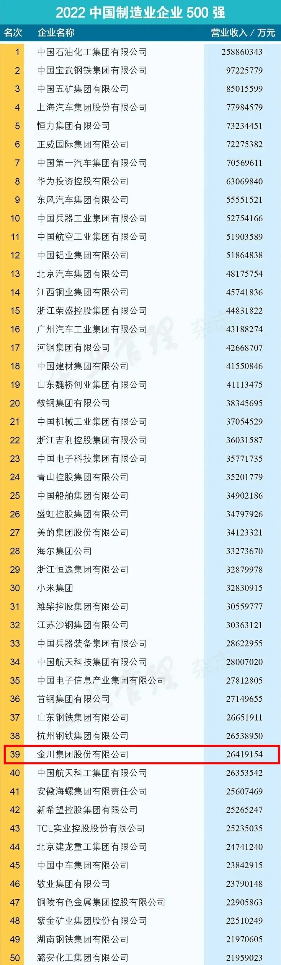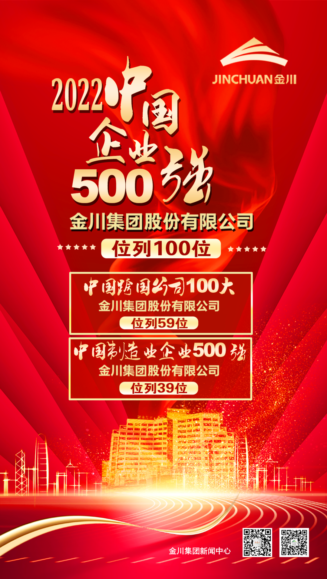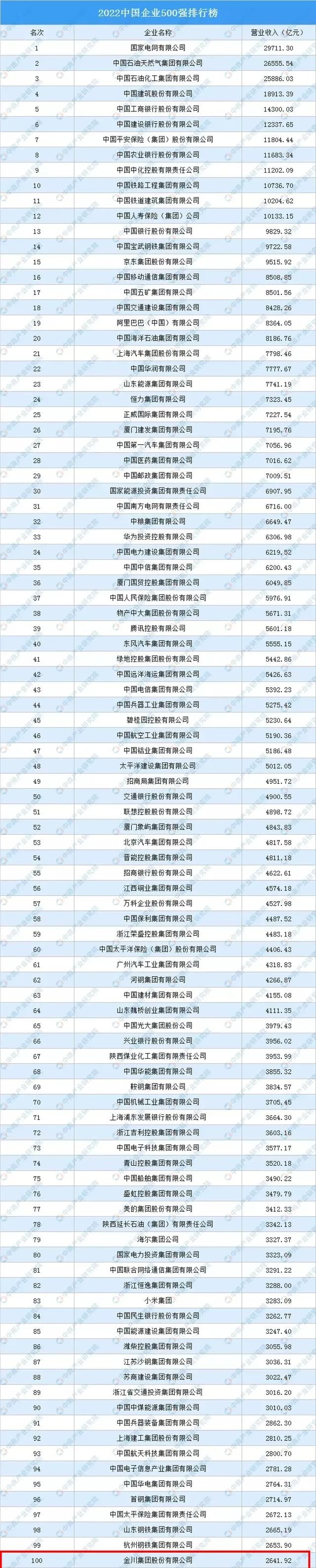 9月6日,中国企业联合会、中国企业家协会(简称中国企联)在京举办新闻发布会,发布了“2022中国企业500强”榜单,金川集团股份有限公司以营业收入26419154万元,位列2022中国企业500强第100位,中国制造业企业500强第39位,以海外资产3706227万元位列中国跨国公司100大第59位。