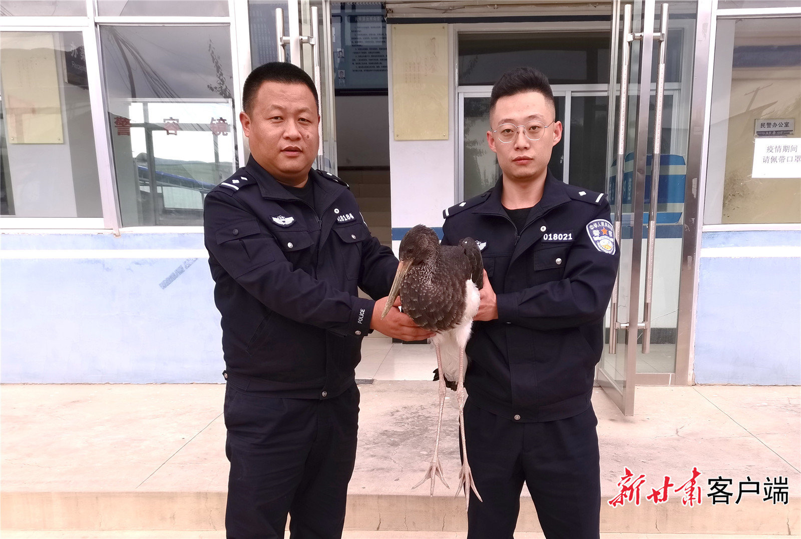 9月21日下午2时许,永登县公安局民乐派出所接到辖区前庄村大什社治安户长电话报警称,在该社村口的沙地里,有一只体型巨大的黑鸟从天而降,一动不动,吸引不少村民围观。民乐派出所民警立即驱车赶到现场,发现该鸟体长1米左右,虽然“大鸟”身体无明显外伤、精神状态尚好,但已不能正常飞行。民警在电话联系森林派出所和县自然资源、林业等部门工作人员的同时,暂时将“大鸟”带到派出所喂水喂食,后经专家鉴定为国家一级保护动物黑鹳。9月22日,黑鹳情况初步稳定后,民乐派出所民警立即驾车将其送往兰州市野生动物救护站进行体检、休养,待其身体机能全部恢复后,将被放归自然。