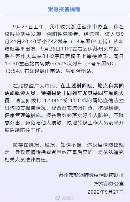 9月27日上午,江苏苏州市收到浙江台州市协查,称在核酸检测中 发现一例阳性感染者。 经流调, 该人员9月24日20:40乘坐Z42次列车(14车厢04上铺)从新疆吐鲁番出发,9月26日11时左右到达苏州火车站, 后在苏州火车站B4检票口旁椅子上等待换乘,同日13:30左右站内转乘G7575次列车(3号车厢5D),13:54左右途经昆山南站,后到台州站。