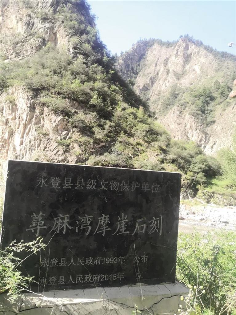 九百年后的一个秋高气爽的午后,有几个后人怀着对荨麻湾摩崖石刻的向往,怀着对先人的崇敬,踏上了寻找永登水磨沟荨麻湾摩崖石刻的旅途。一行人驱车从水磨沟口进入,其中的一位先生老家在当地,大家只是知道摩崖石刻所在的位置在进入水磨沟四公里左右公路下面沟谷的某处石壁上面,但从没有人走到石刻近前一睹芳容。当我们一行把车停在路旁,从公路右侧走下去,便进入到一个沟谷,这里就是荨麻湾所在地。我们看见沟谷的山坡上竖立着一块石碑。石碑上面有:“荨麻湾摩崖石刻”几个字,才知道我们寻找的宋朝摩崖石刻一定就在这附近。