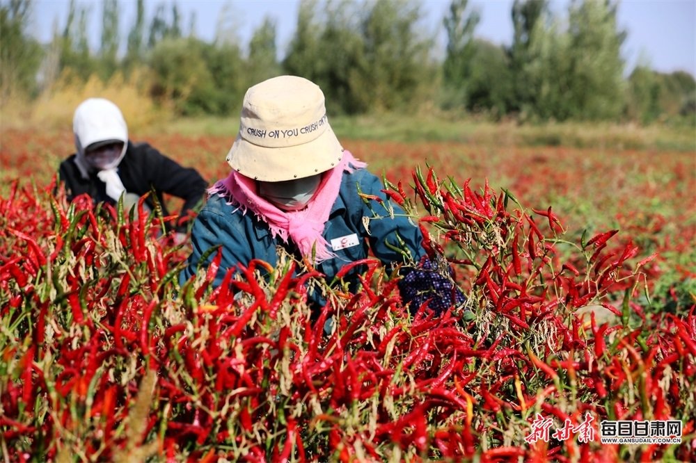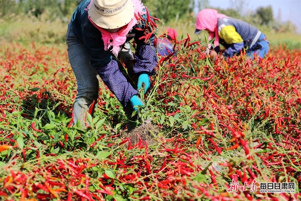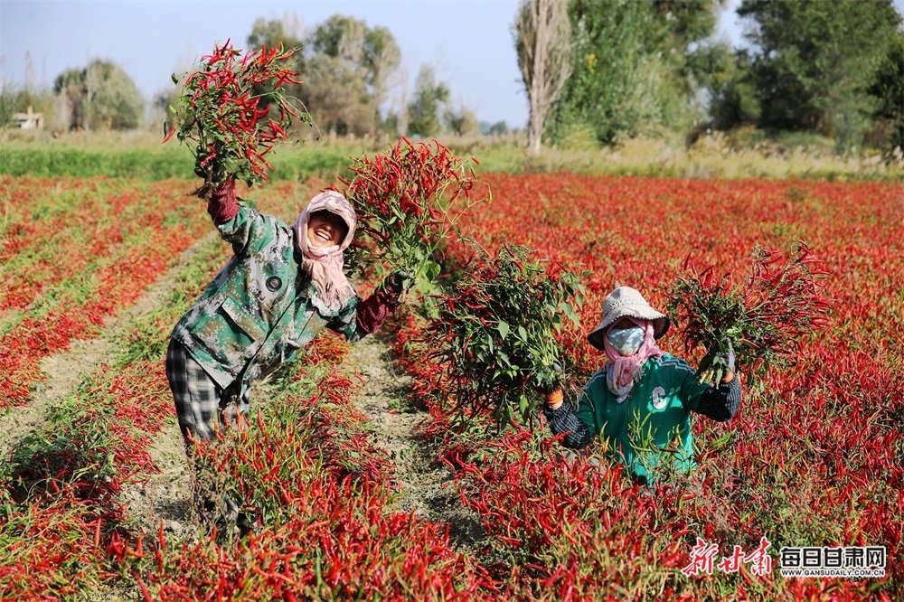 金秋十月,正是辣椒采收的黄金时节,在甘肃省张掖市甘州区乌江镇敬依村辣椒种植基地里,红红的辣椒挂满枝头,当地村民正抢抓晴好天气采收成熟的辣椒,采摘、分拣、装箱、现场一派丰收繁忙的景象。