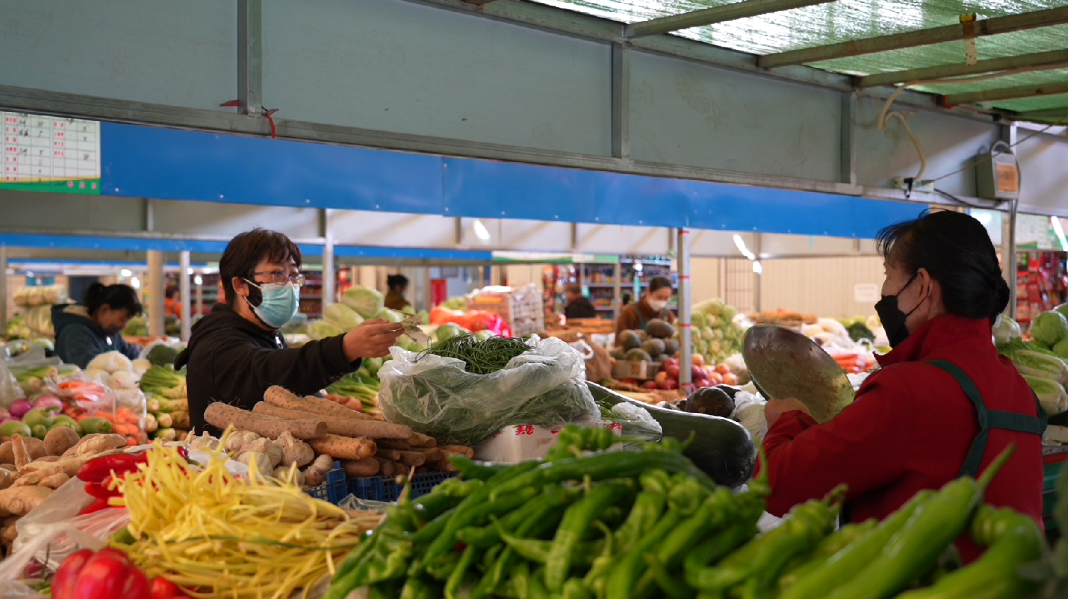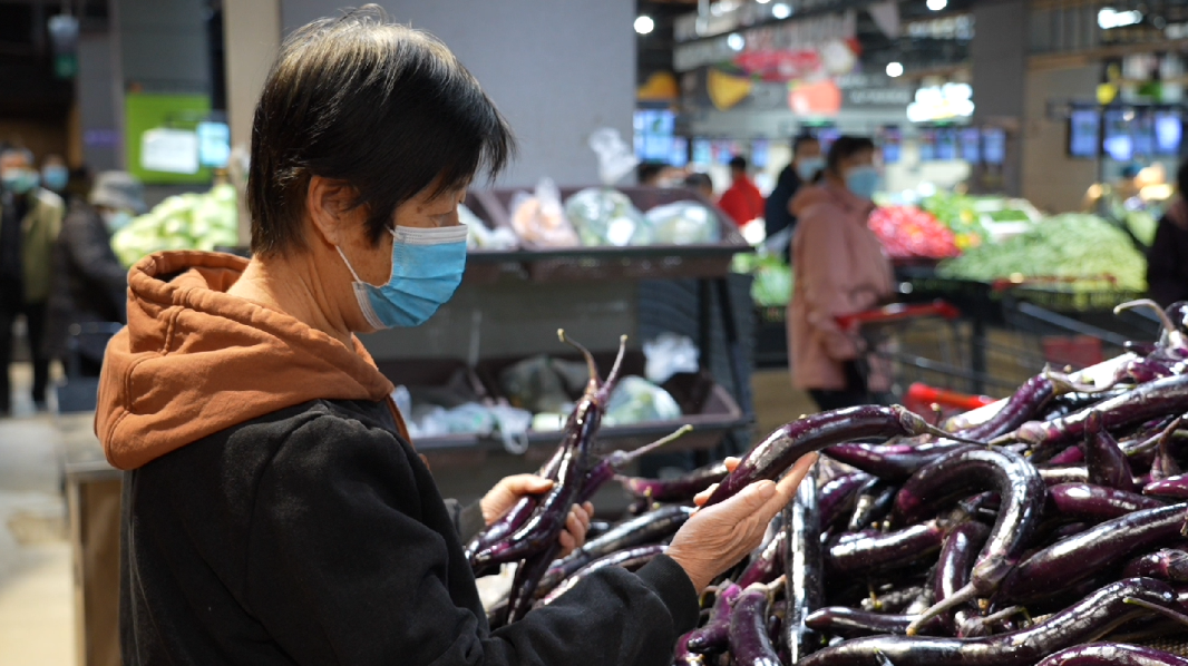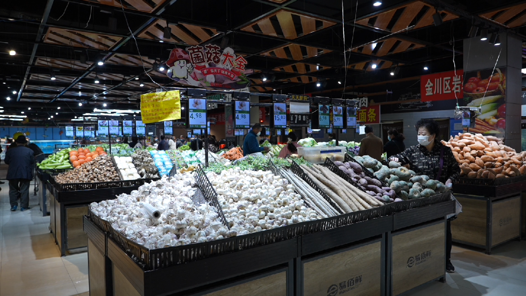 易佰鲜生活超市是一座综合性的超市,商品涵盖蔬菜、肉蛋、水产、农副产品等众多品种,是保障周边群众生活的重要场所,超市内各类蔬菜一应俱全,市民在佩戴口罩、扫场所码和测温后就可以进入正常购物。