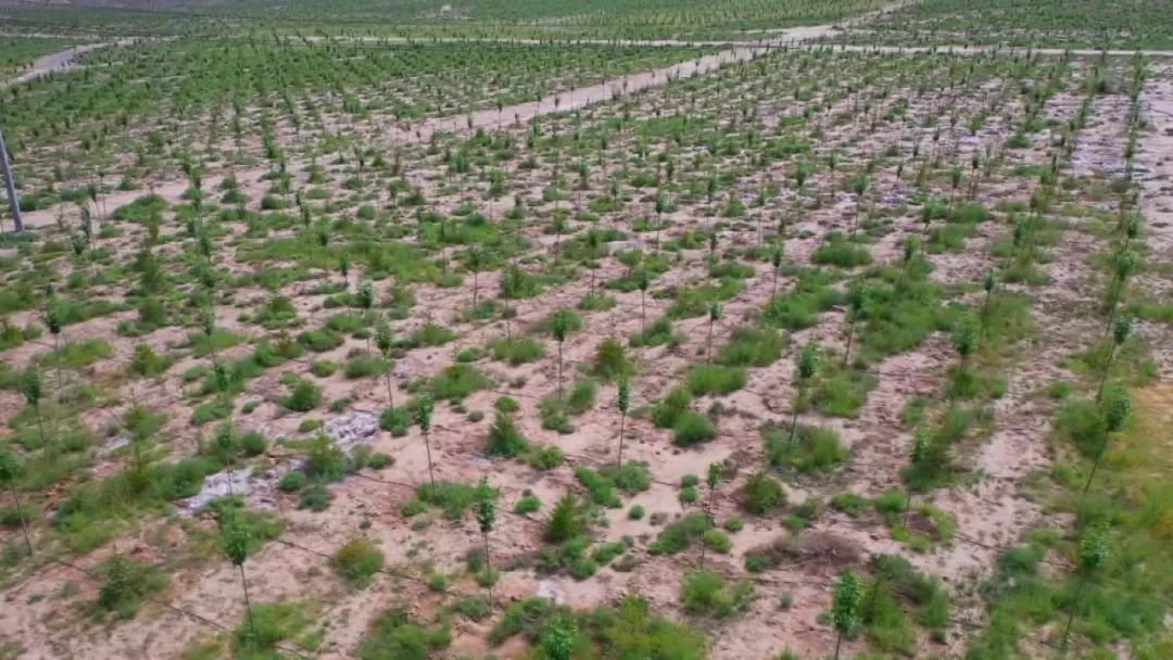 景泰县地处黄土高原和腾格里沙漠过渡地带,山区坡地储水难,为确保栽植苗木的成活率,林苗灌溉全部采用高效节水滴灌方式。