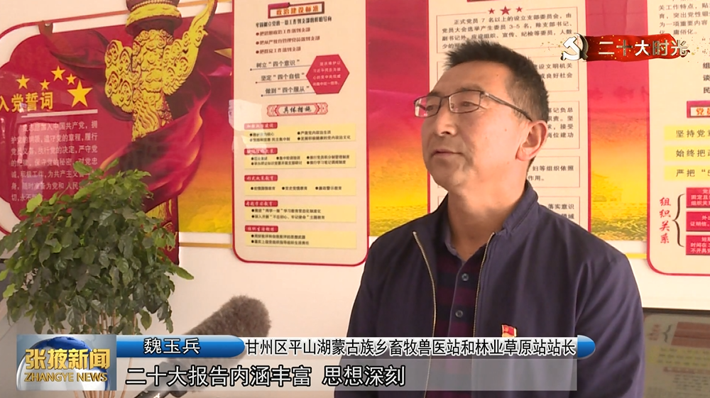 甘州区平山湖蒙古族乡畜牧兽医站和林业草原站站长 魏玉兵:“二十大报告内涵丰富、思想深刻,听后激励人心,鼓舞斗志,作为一名党员,我要牢记为人民服务的宗旨,全身心投入到动物疫病防控工作中。”