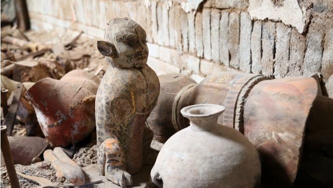 今年10月11日,考古部门再次公布了对吐谷浑墓葬的最新考古成果。通过今年的考古发掘,其中一处墓葬内出土陶器、木器、丝织品、金属器等各类文物数十件,以木器为主。其中主室内主要出土一些木器残件、木构件及丝织品残件。东西耳室出土木马俑及木风帽俑残件,墓道南侧灰堆内出土有唐代纪年墨。