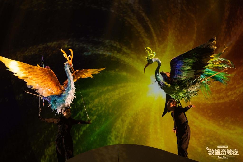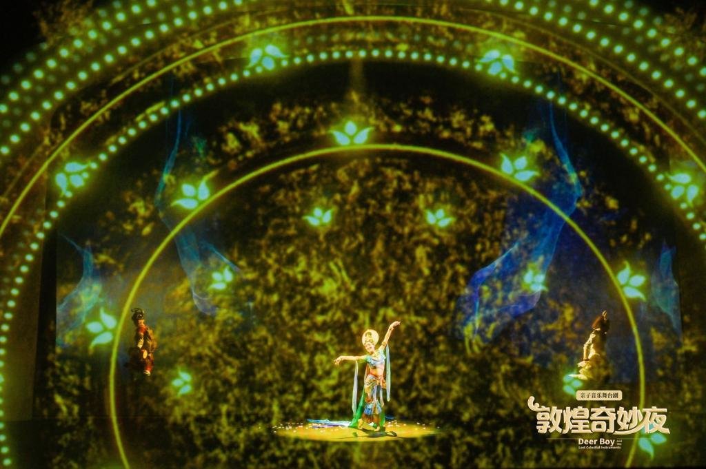 舞台上,千年敦煌在东方写意的美学风格及多媒体的展现下绚丽夺目。漫天黄沙的 “破坏力量”、拥有“先知光辉”的守经鸟们、九色鹿的“星光传送门”、鹿鸣的“守护力量”以及九层楼、十二宫、天宫乐器等多重传统元素,令人仿佛置身于神秘又绝美的敦煌世界中。剪影层叠艺术手法加上剧场内的漫天花瓣,多重视觉体验打造专属于亲子时光的剧场氛围。