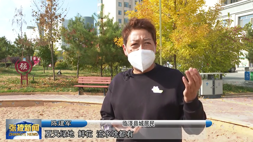 临泽县城居民 陈建军:“冬天有长青的松树、柏树,夏天有绿地、鲜花、流水,我们出来散散步,带着孩子出来玩,空气也好,风景也好,人的心情也好。”