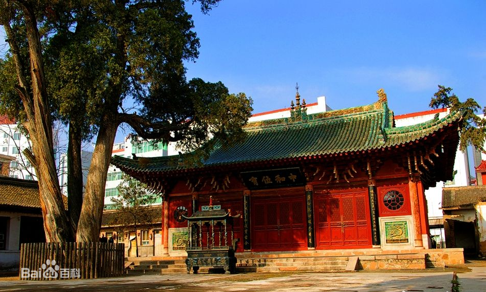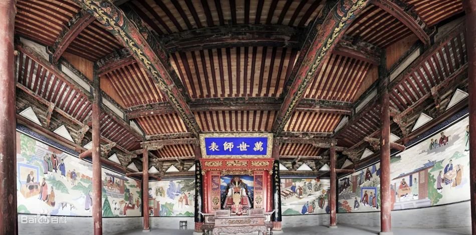殿阁雕梁、圣祠三楹、古柏林立