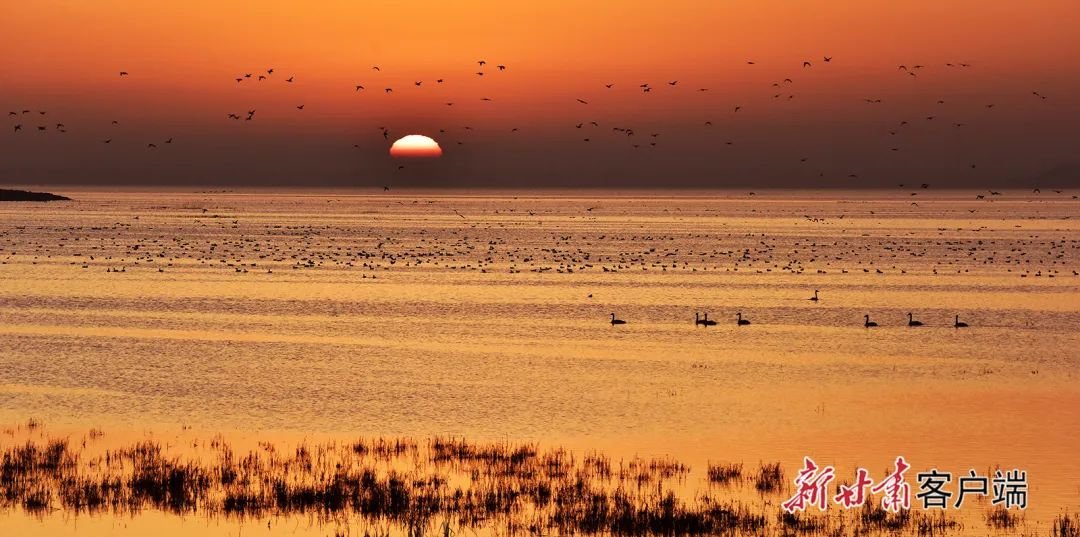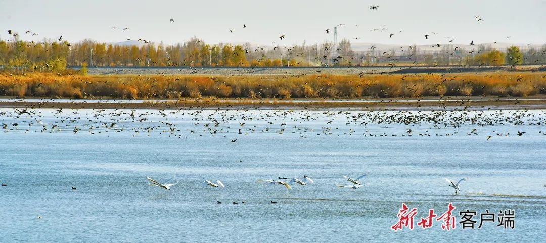 11月6日,在亚洲最大的沙漠水库民勤县红崖山水库,数万只、几十种水鸟大天鹅、大雁、赤麻鸭、白鹭、海鸥、琵嘴鹭在水中自由自在地游弋觅食,在水面追逐嬉戏,展翅翱翔。民勤越冬水鸟的增多,得益于生态的持续好转。通过石羊河流域的重点治理,民勤县生态环境得到改善,生态环境恶化趋势得到有效遏制。据统计,近几年民勤县红崖山水库迁徙的候鸟达3万到5万多只,有大天鹅、白鹭、豆雁、琵嘴鹭、白尾海雕、黑鹳、灰鹤等80多个品种。