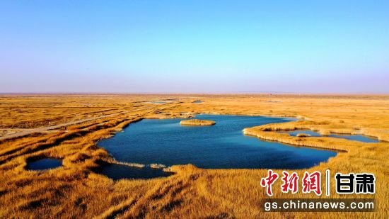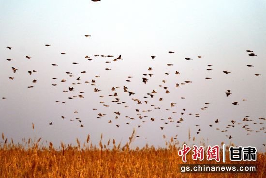 时至冬日,甘肃武威市民勤县大漠水库——青土湖秋色仍存,披上了金色外衣。芦苇轻轻摇曳,倦鸟归巢,湛蓝的湖水荡起层层涟漪,夕阳、湖水、飞鸟与金色的芦苇荡相映成趣,一幅美丽生动的画卷徐徐展开。 (吴苗 王菊虹)