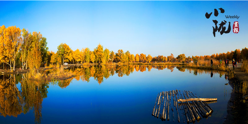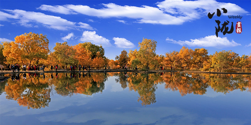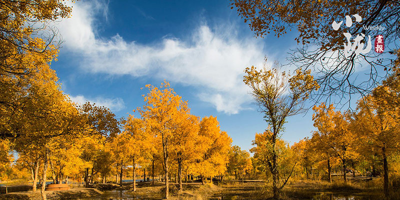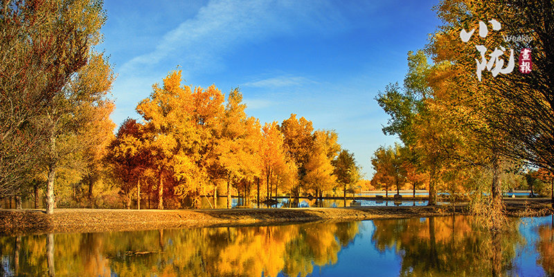 秋风起时,一树金黄在湛蓝的天空下连绵不绝,映着湖面,和流云飘逸的蓝天一起,绽放成一幅壮丽的图景。