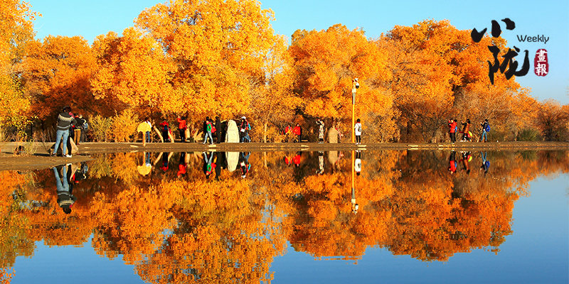 漫步林中,就仿佛进入神话中的仙境。茂密的胡杨干奇百怪,神态万般。粗壮、沧桑的胡杨几个人难以合抱,挺拔的有七八丈之高,怪异的似苍龙腾越、虬蟠狂舞。每一棵高大的树冠枝头,间或又有浅绿、淡黄的叶片在闪现,错落有致,色彩缤纷,满眼的赤橙黄绿与盈盈秋水互相映衬,令人叹为观止。