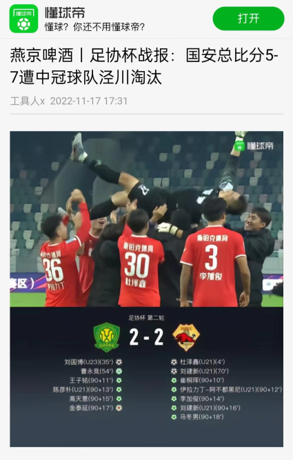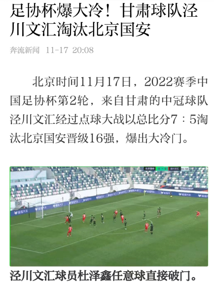 2022年11月17日,懂球帝第一时间爆出2022赛季中国足协杯“大冷门”。在2022赛季中国足协杯第2轮比赛中,来自西北边陲小城的中冠球队泾川文汇经过点球大战,以总比分7:5淘汰北京国安晋级16。