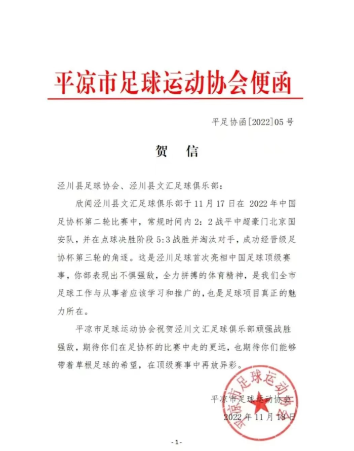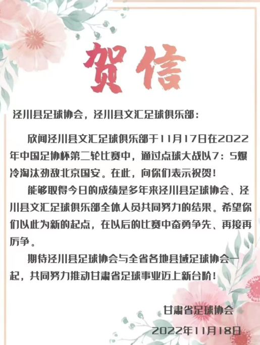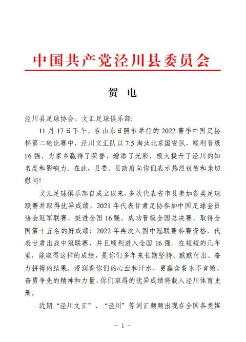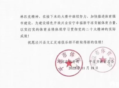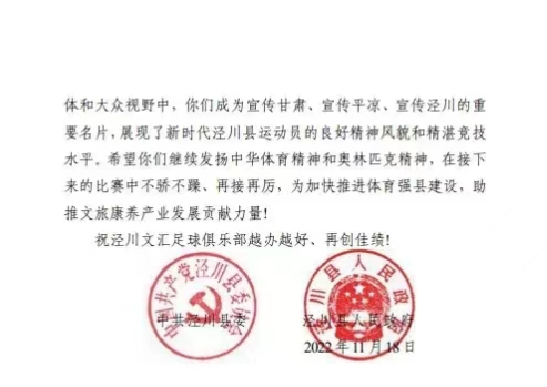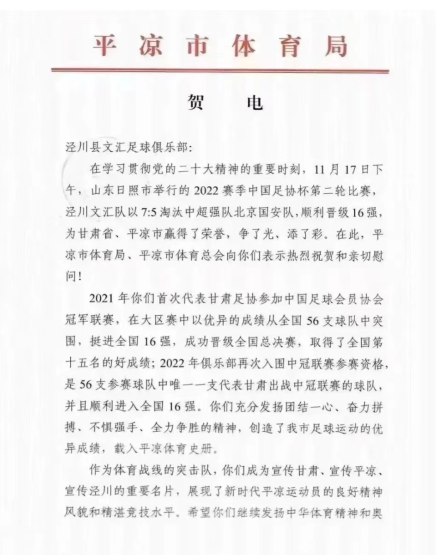 一场足球赛带火一座城,随后省市相关单位和泾川县委、县政府第一时间向泾川县足球协会、泾川文汇足球俱乐部发去贺信!