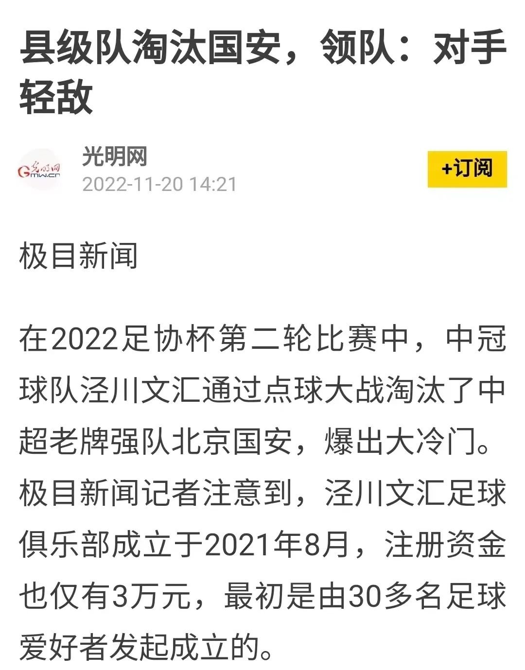 光明网发布《县级队淘汰国安,领队:对手轻敌》。