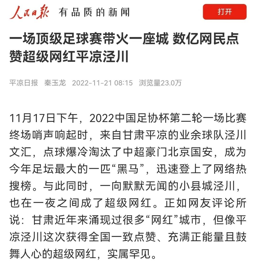 人民日报客户端发布《一场顶级球赛带火一座城 数亿网民点赞超级网红平凉泾川》