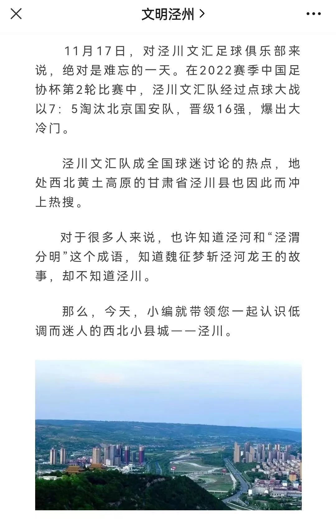 11月18日下午,泾川县委宣传部在其微信公众号“文明泾州”上发布赵永刚撰文、李聪设计制作原创作品《泾川文汇战胜北京国安,“出圈”的小城泾川到底长啥样?》此文刊发后,纷纷被各大媒体转载。