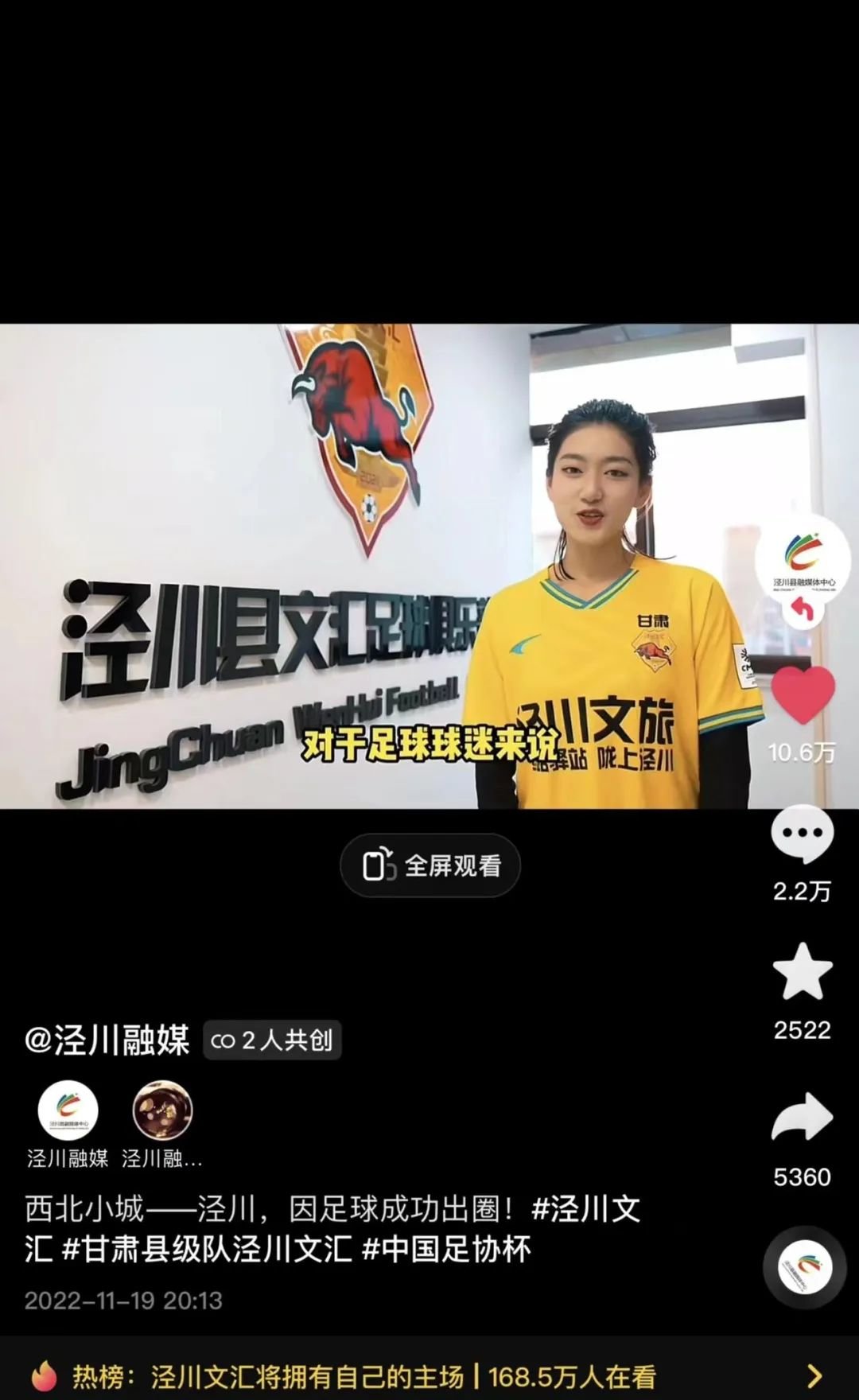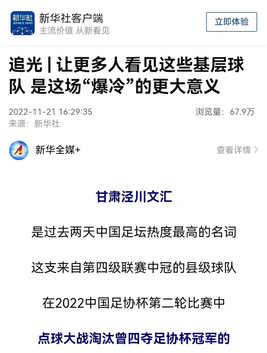 中央广播电视总台新闻纵横发布《足协杯淘汰顶级联赛劲旅 第四级联赛球队甘肃泾川一战成名》