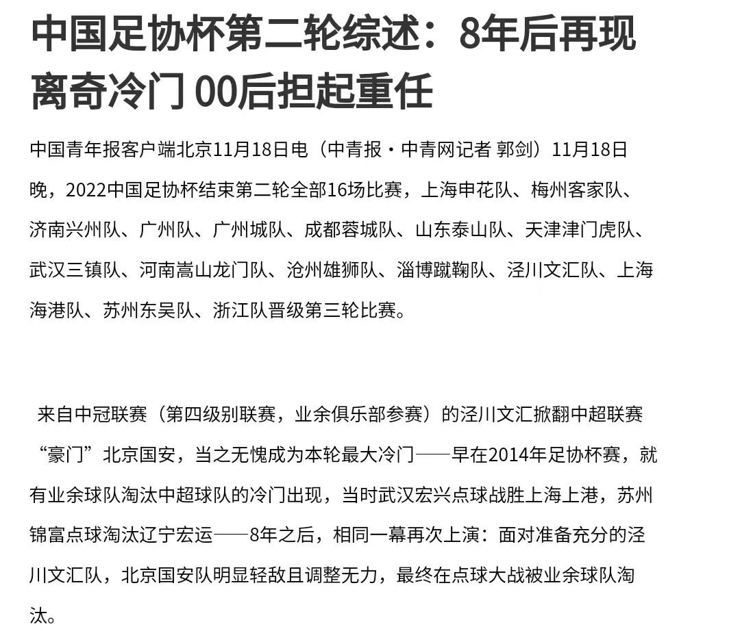 中国青年报发布《中国足协杯第二轮综述:8年后再现离奇冷门 00后担起重任》