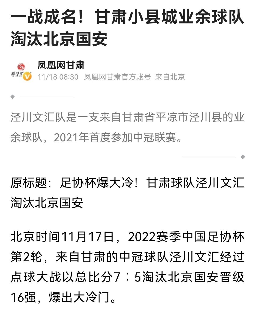 凤凰网发布《甘肃一战成名!甘肃小县城业余球队淘汰北京国安》