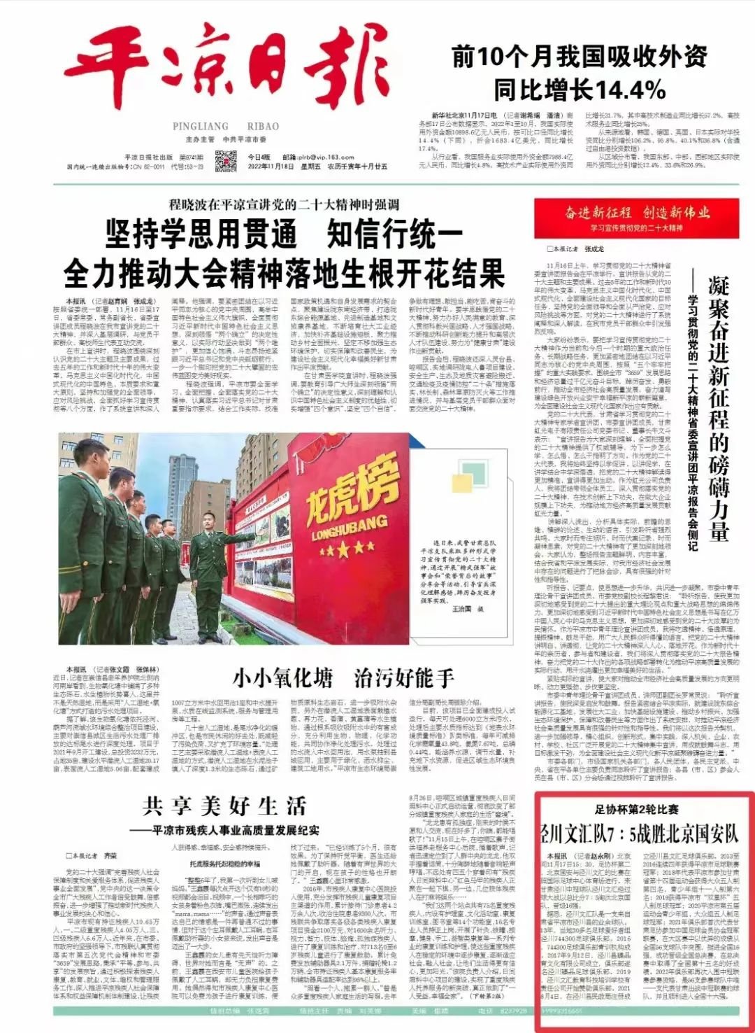 11月18日,平凉日报头版刊登《足协杯第二轮比赛 泾川文汇队7:5战胜北京国安队》。