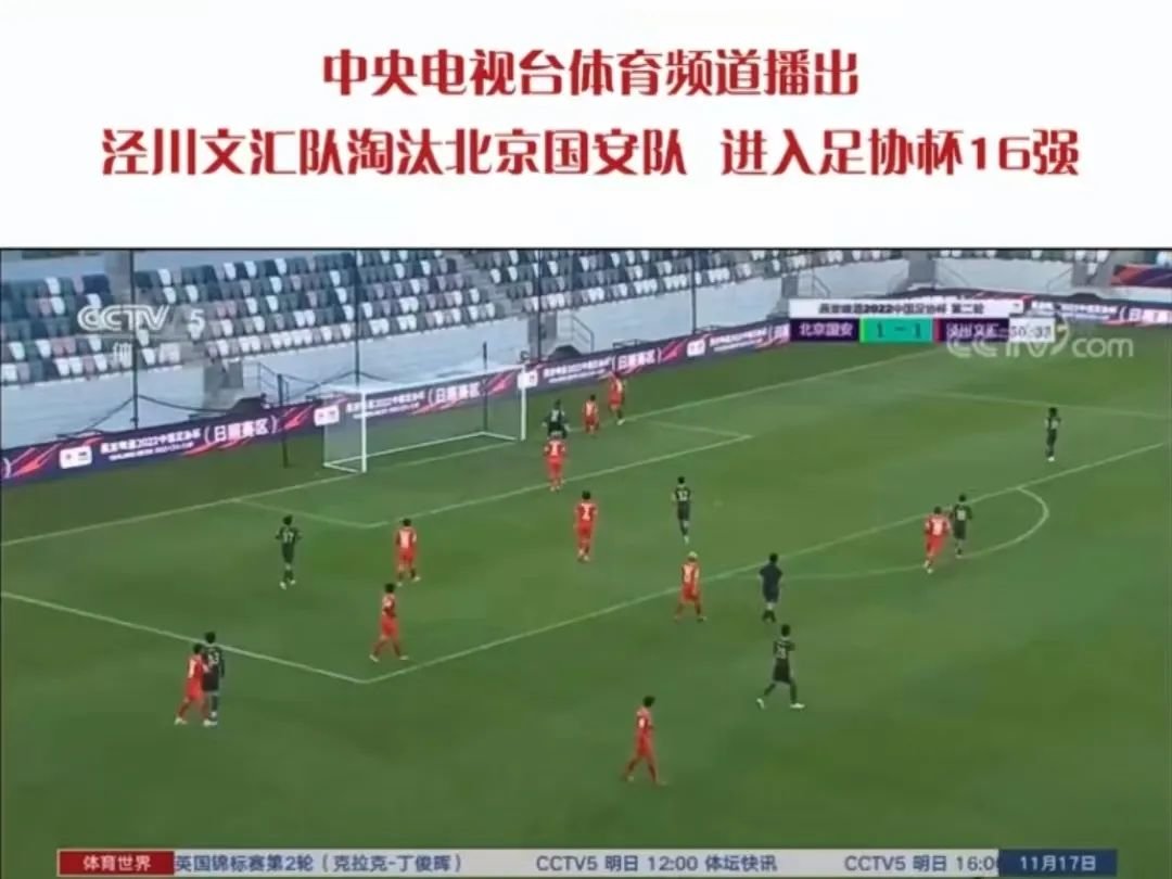 中共中央电视台体育频道播出泾川文汇队淘汰北京国安队,进入足协杯16强。