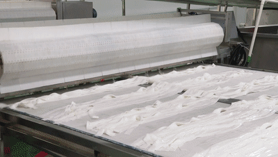 传承延续了百年的技艺,现在通过机器操作实现了量产。经过拌和、压型、熟化、冷却、切条、漂洗、冷却和晾晒等多道工序,最后包装上车,通过物流发往天南海北、千家万户。