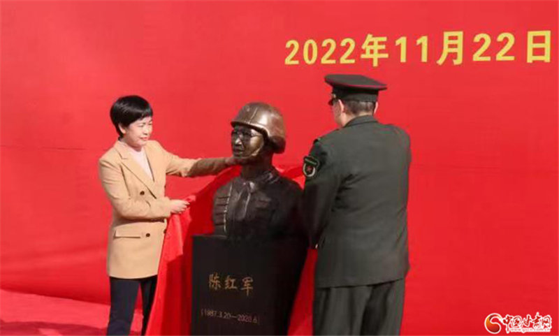 仪式现场,陇南军分区、县委县政府、县人武部领导,陈红军父母、专武干部、消防员、民兵、小学生等100余人整齐肃立。在雄壮的国歌声后,军分区政委王仁富和政府县长武冰为铜像揭幕。