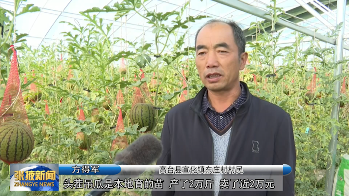 高台县宣化镇东庄村村民 方得军:“头茬吊瓜是本地育的苗,产了2万斤,卖了近2万元。这一茬是南瓜嫁接西瓜苗,一棚栽了4000株苗,元旦前再种一茬叶菜,明年再能实现一年三茬瓜一季菜。”