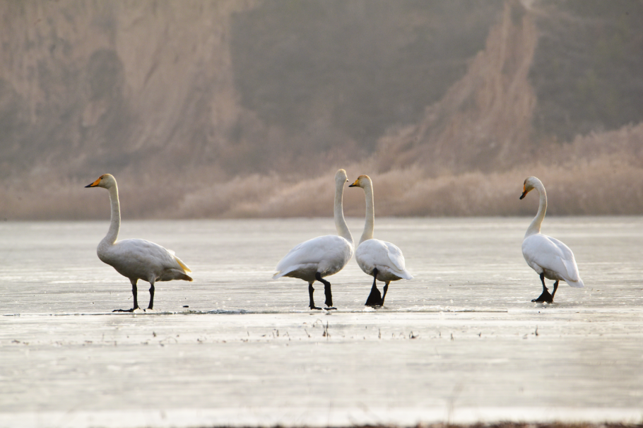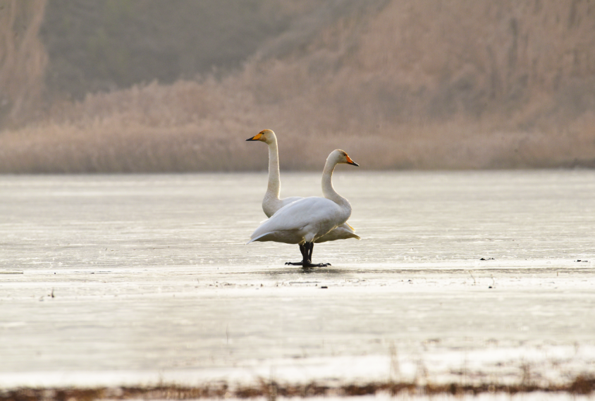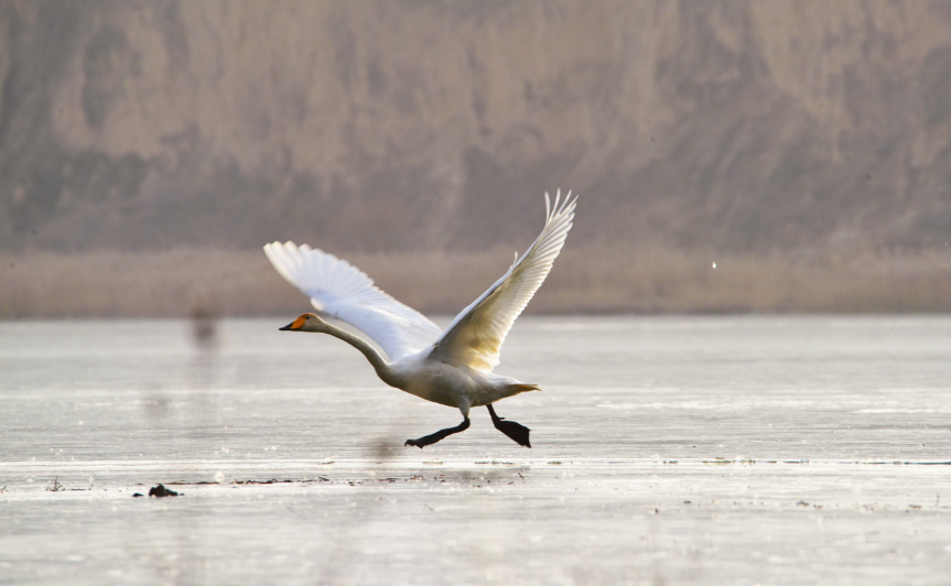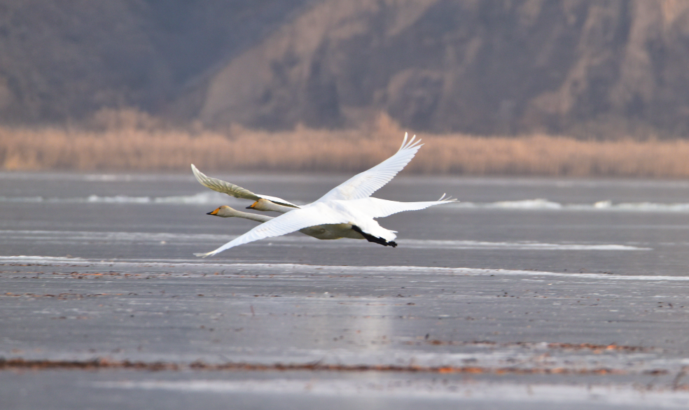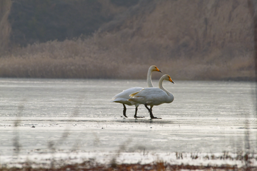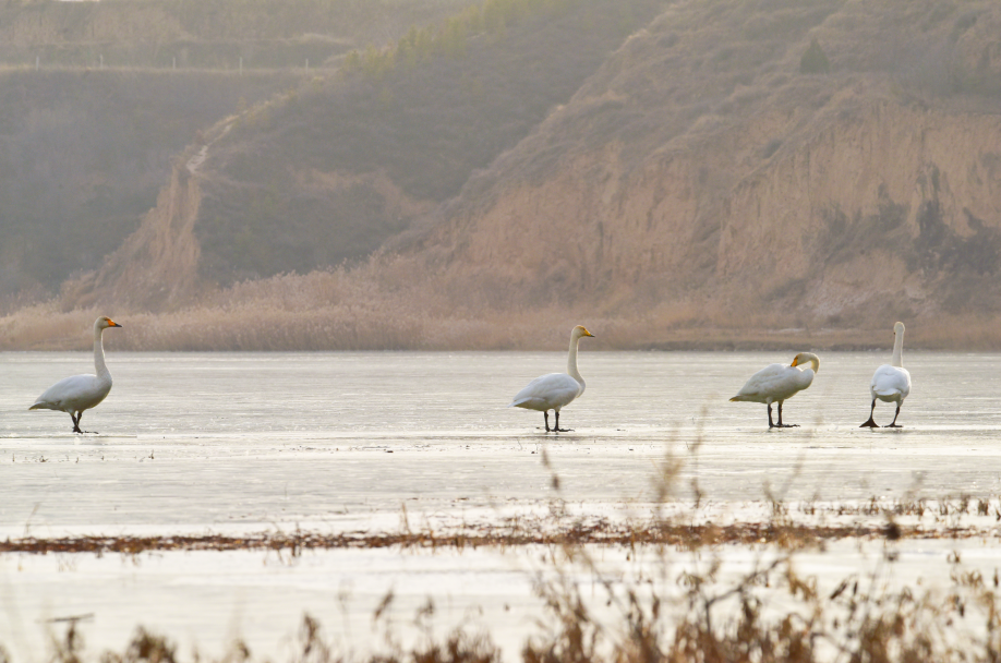 大天鹅(学名:Cygnus cygnus)是一种候鸟,属国家二级保护动物。羽毛洁白,体型高大,体长120-160cm,翼展218-243cm,体重8-12kg,寿命20-25年。嘴黑,嘴基有大片黄色,黄色延至上喙侧缘成尖。习惯栖息于开阔的、水生植物繁茂的浅水水域。大天鹅的分布区非常广阔,而且无论是繁殖期还是越冬期,活动范围都与当年的气候因素有着密切的关系。据查,平凉市曾有迁徙过境大天鹅受伤得到救治的新闻报道,但拍摄到野生大天鹅活动并不多见。