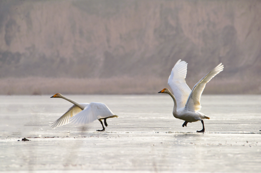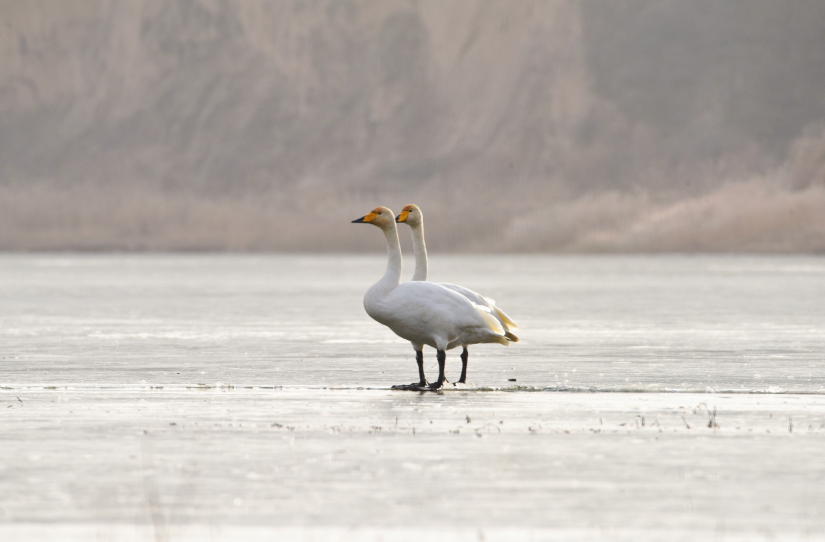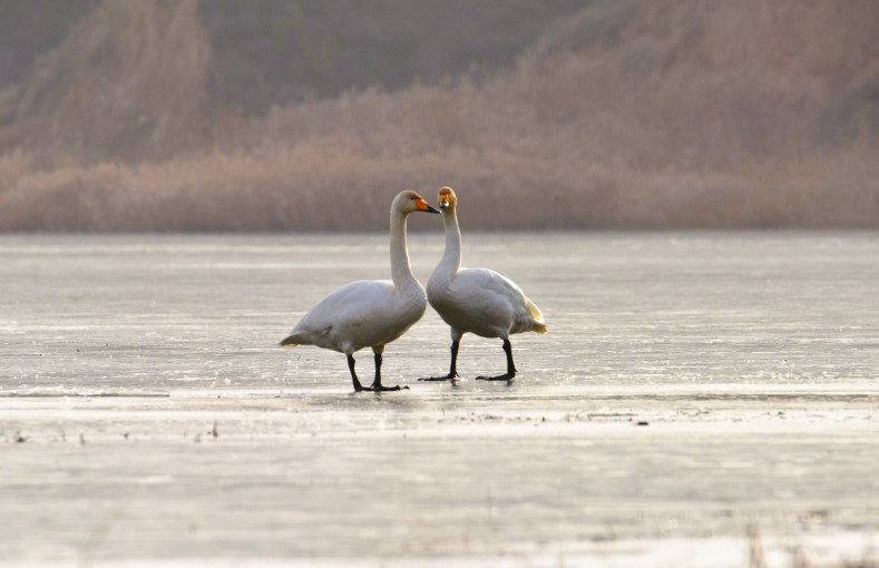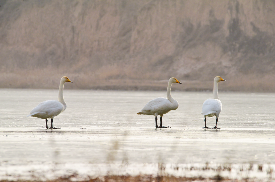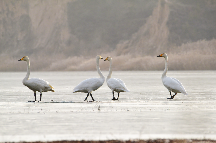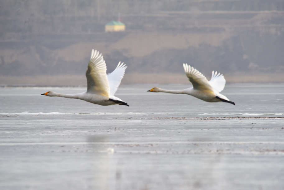 大天鹅(学名:Cygnus cygnus)是一种候鸟,属国家二级保护动物。羽毛洁白,体型高大,体长120-160cm,翼展218-243cm,体重8-12kg,寿命20-25年。嘴黑,嘴基有大片黄色,黄色延至上喙侧缘成尖。习惯栖息于开阔的、水生植物繁茂的浅水水域。大天鹅的分布区非常广阔,而且无论是繁殖期还是越冬期,活动范围都与当年的气候因素有着密切的关系。据查,平凉市曾有迁徙过境大天鹅受伤得到救治的新闻报道,但拍摄到野生大天鹅活动并不多见。