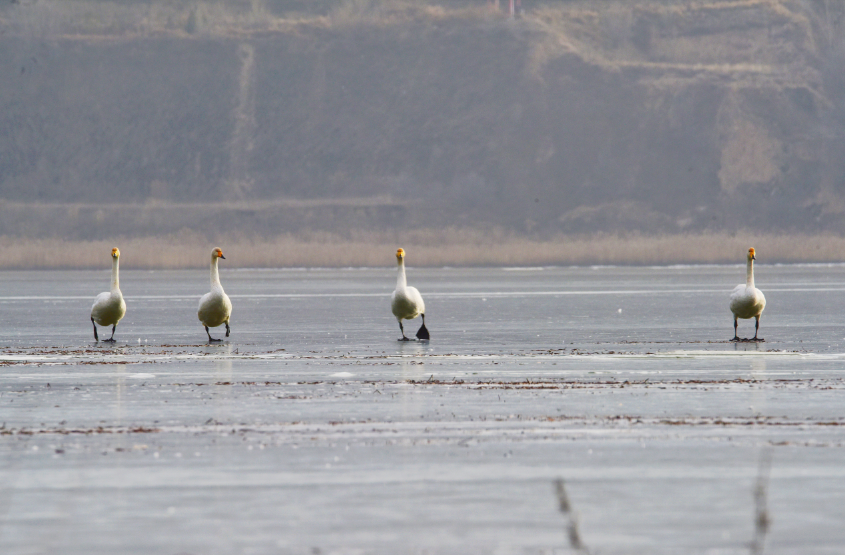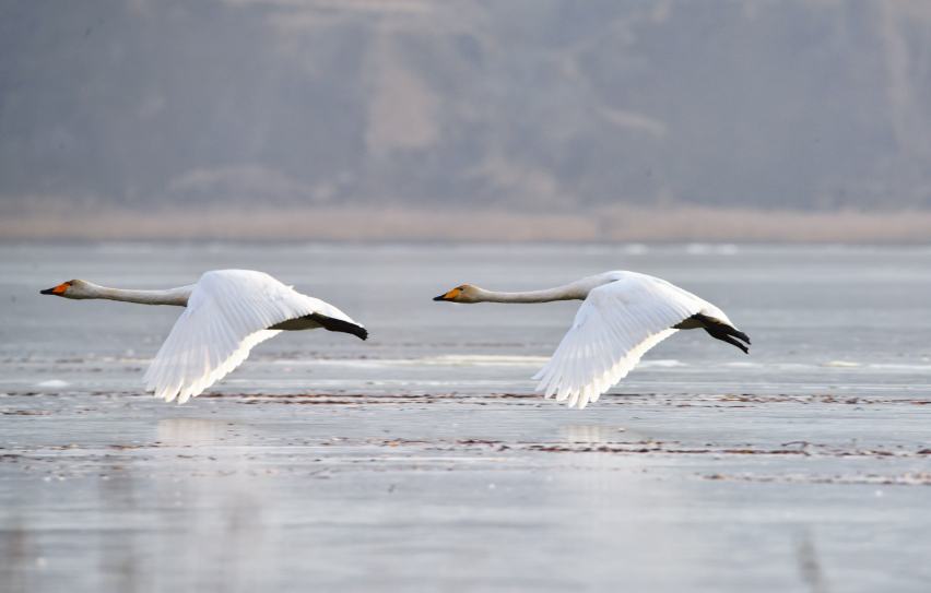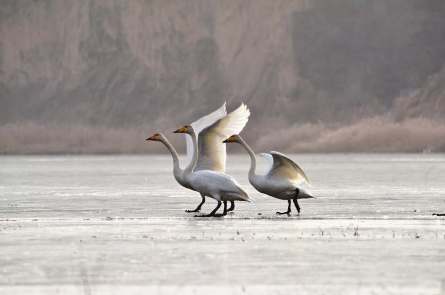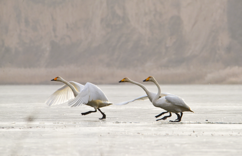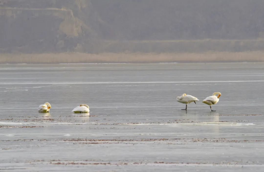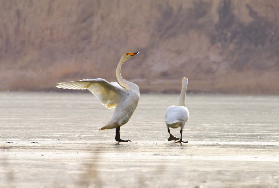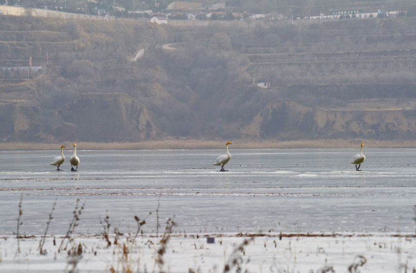 原来,当张老师将长焦镜头推上远处的湖面时,竟然发现有大天鹅的倩影!她仔细一数,共有2对4只!它们或游弋觅食,或展翅嬉戏,或比翼翱翔,悠闲从容、卓然高贵。张老师激动地说:这是她多年坚持在静宁县悬镜湖拍摄珍禽水鸟以来首次见到大天鹅。