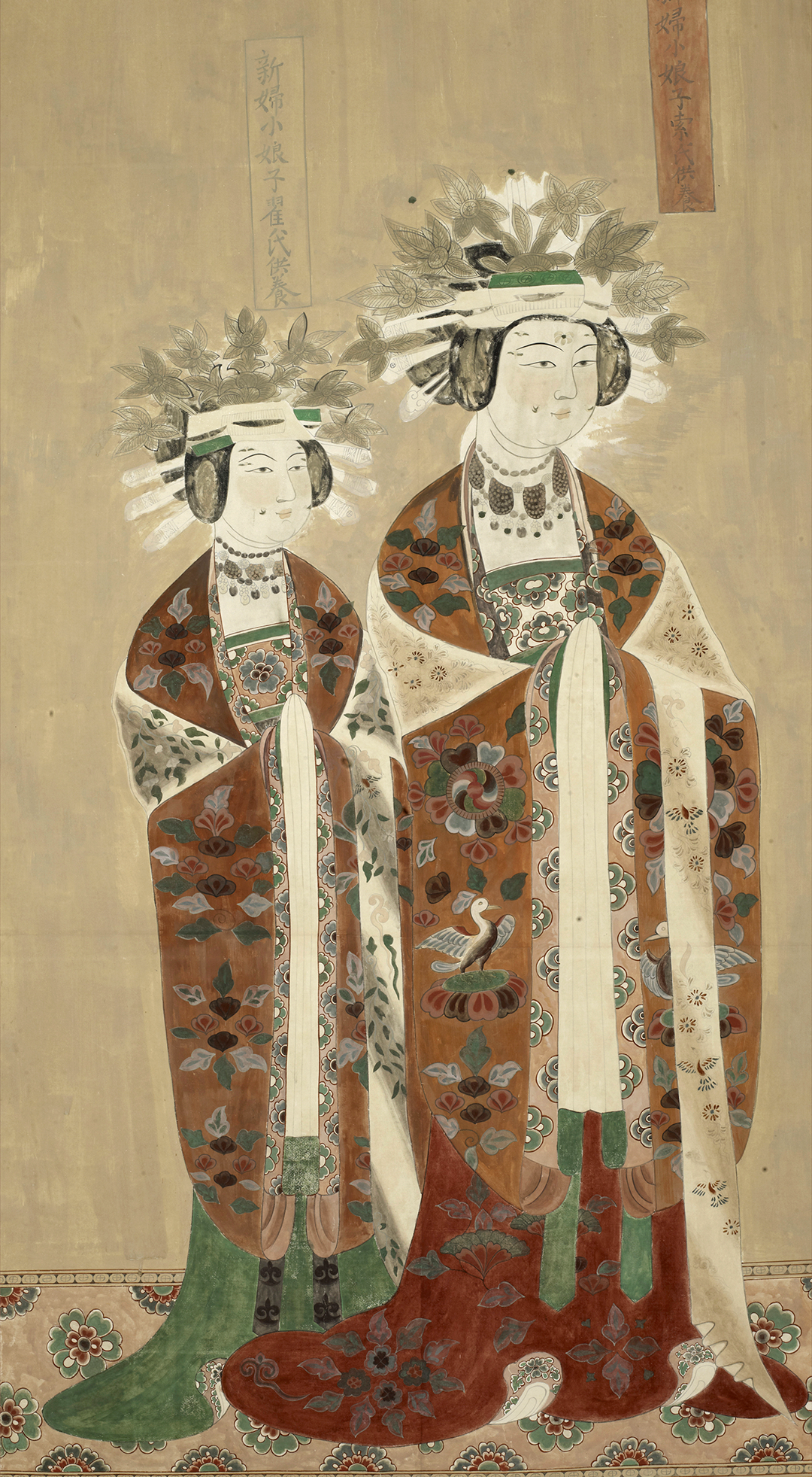 莫高窟第61窟是河西归义军节度使曹元忠夫妇所建的功德窟,窟内画有众多的曹氏家族供养人像。他们头戴桃形冠,身穿翻领大袍,项饰珠宝,面部装饰花钿,表现出典型的回鹘民族服饰特点。气派非凡,显示出了高门贵族的雍容华贵。