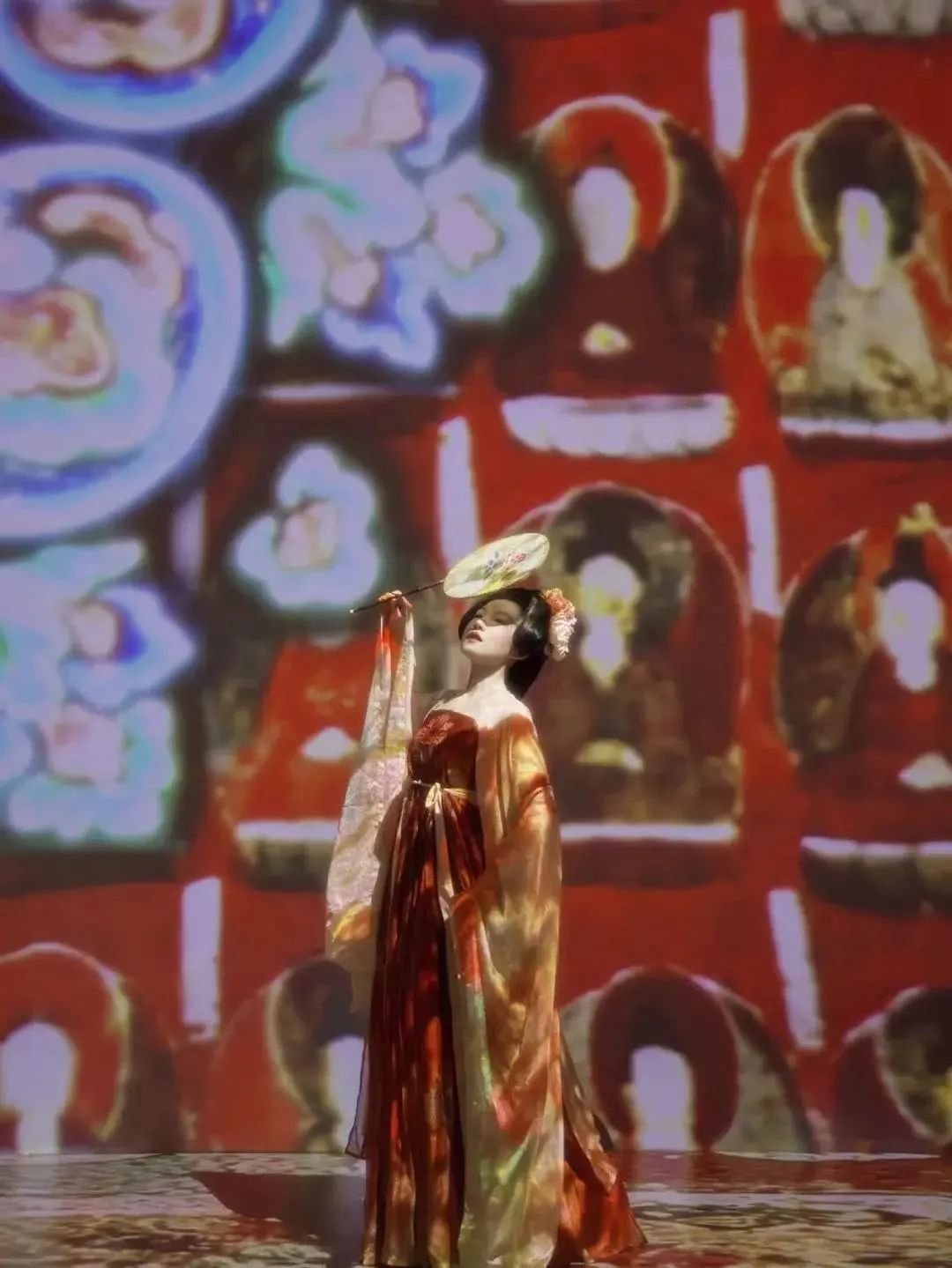 本次,“遇见敦煌 光影艺术展”将敦煌石窟彩塑壁画,以光影形式带到了上海。当我们置身敦煌光影空间时,不仅可以领略飘舞在窟顶藻井上伎乐飞天曼妙的舞姿,还可以看到那一时期中国传统服饰的博大精深。