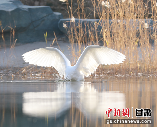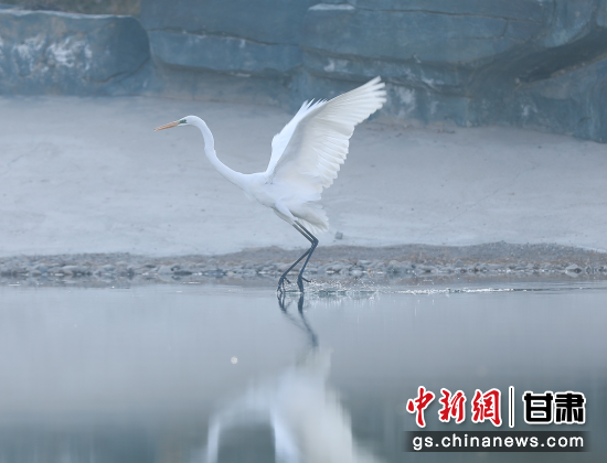 原标题:一羽白鹭造访甘肃中医药大学校园 戏水展翅姿态优美