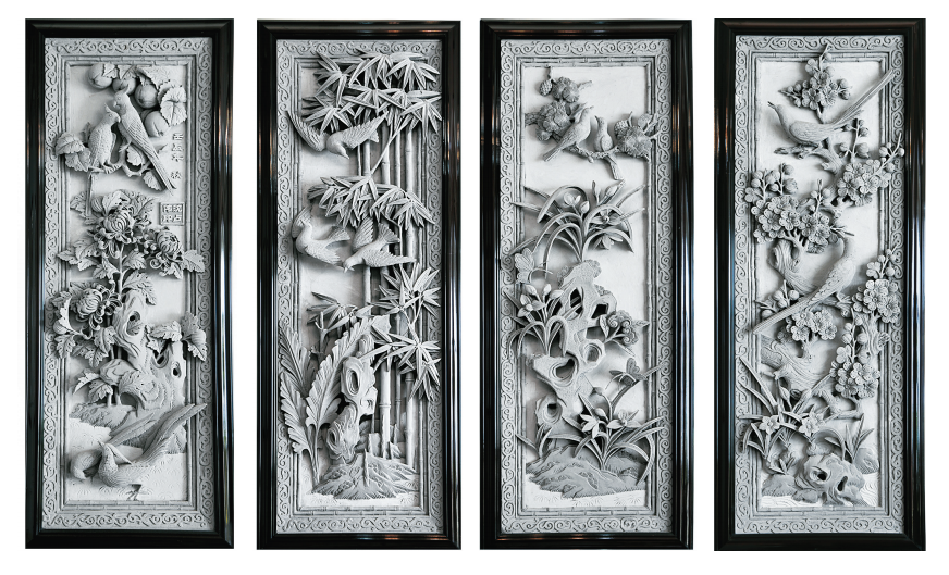 我的成品一般用于天井、山墙、影壁、廊心壁、丹墀、台阶、下槛、墀头、须弥座、屋脊等处。雕刻题材可分自然景物、社会生活及富有民族特色的装饰纹样三类。