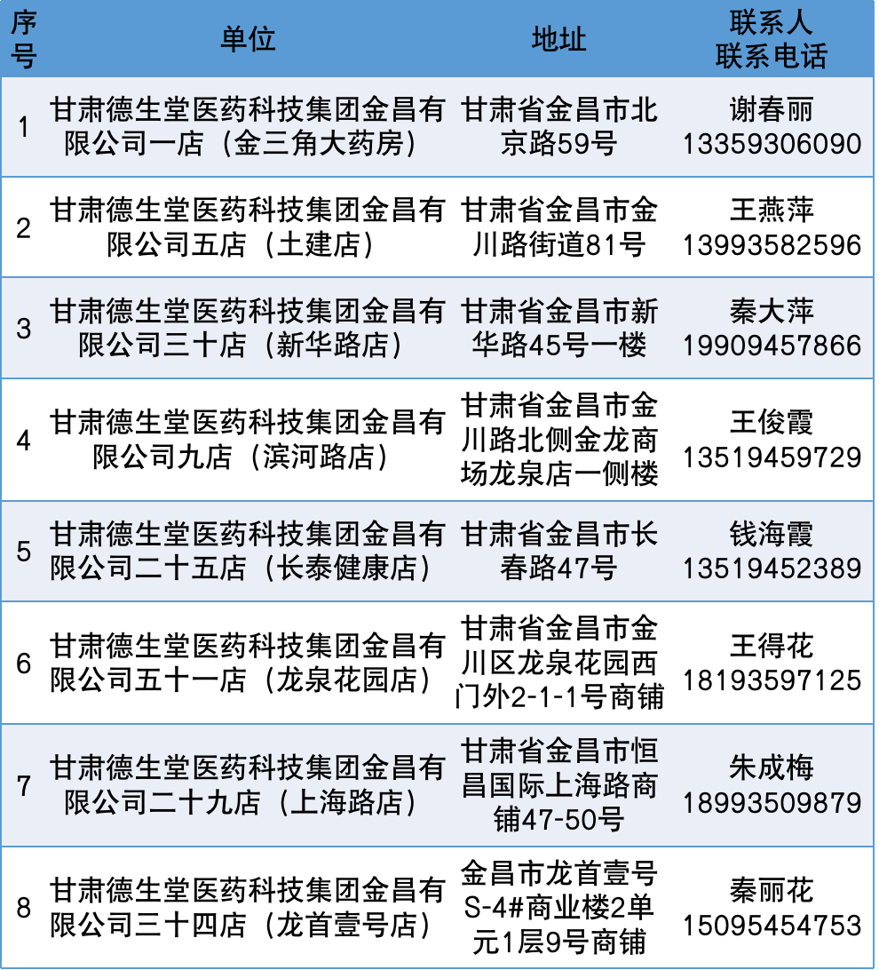 甘肃德生堂医药科技集团金昌有限公司将于12月25日9时起,将紧急购进的12万片布洛芬免费发放给广大市民。市民可凭身份证,从市内甘肃德生堂医药科技集团金昌有限公司以下任一药店领取(每人6片,若无急需,恳请将机会留给他人)。