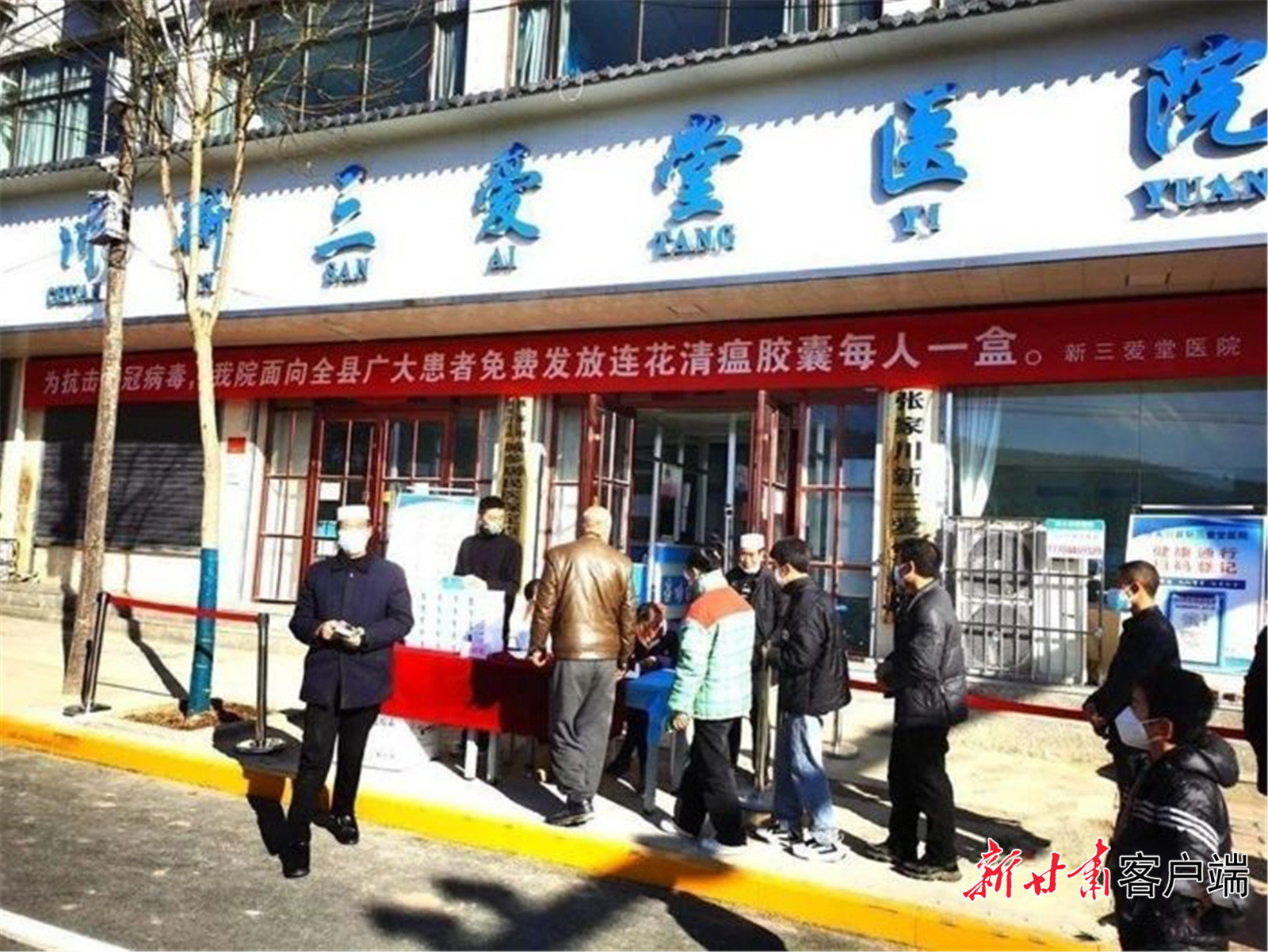 12月23日上午,在张家川回族自治县张家川镇和平西路新三爱堂医院门前,不少居民排队领到了连花清瘟胶囊。