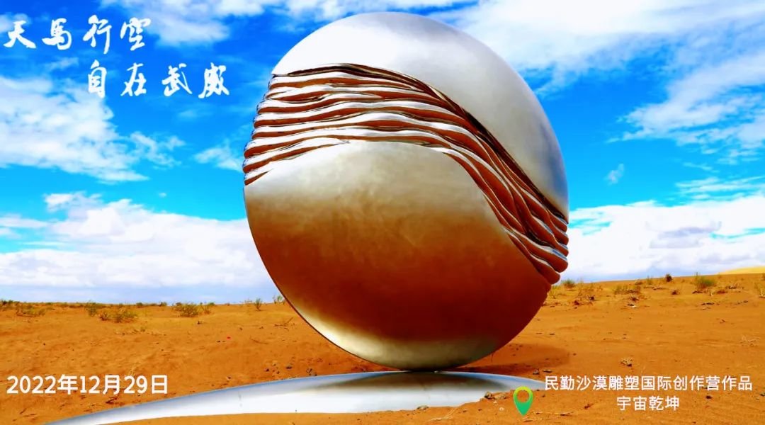 作品寓意:天地宇宙庞大,圆弧的不锈钢镜面,能把浩渺的天空,以及宽广的沙漠统统映射其中。中间的条纹形状,象征着沙漠孕育的生命之河。