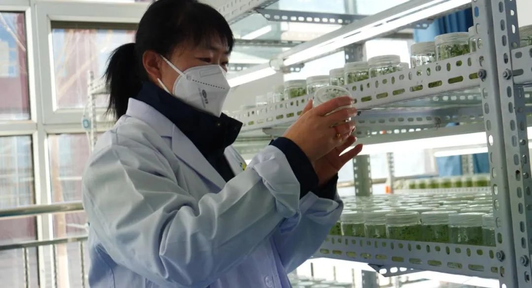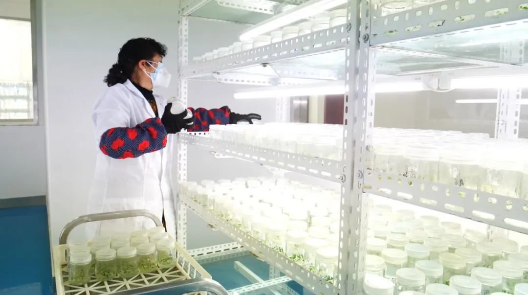 “这是转接3-4天的组培苗,最近几天要放到培养室进行培养,我们公司年生产马铃薯组培苗是1500万株,这两天大概有15名工作人员在紧张快速扩繁,以完成明年智能温室的4万平米移栽工作。”甘肃天润薯业公司组培中心部门负责人蔺瑾说。