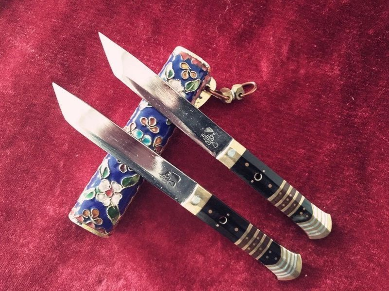 其种类繁多,各具特色,比较著名的腰刀有:“什样锦”“雅王其”“波日季”“一刀线”“双落”“满把”“扁鞘”等。刀面上,分别镌刻着手、龙、梅花等各种图案,其中,最漂亮的还数“什样锦”。