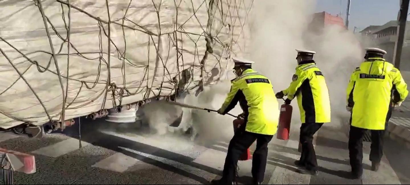 1月18日,永昌交警在执勤时发现一辆挂车轮胎着火,瞬间变身消防员快速灭火为车主挽回了巨额损失。