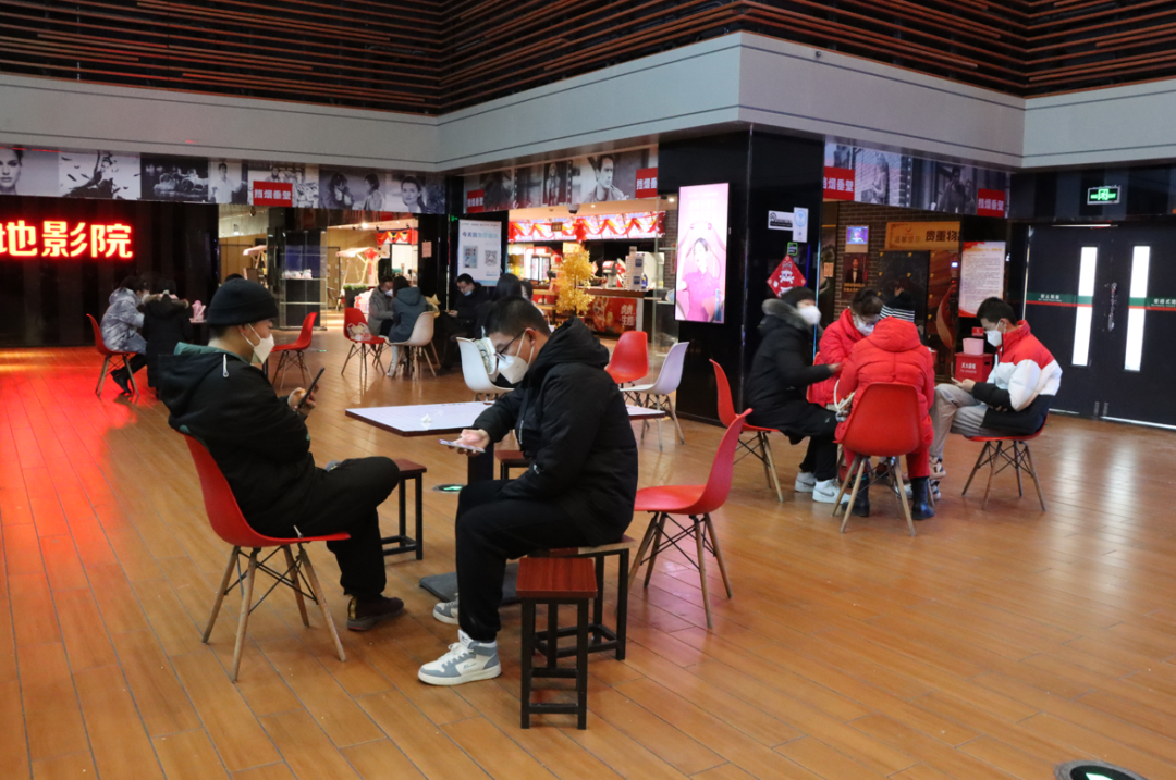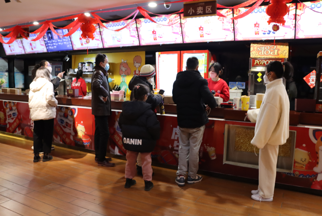 走进大地影院,各处都装扮上了新年的装饰品,影院墙和走廊里也布置了春节档的电影宣传海报,现场充满浓厚的新春气氛。影院售票区和取票机前,观影群众有序排队购票,等待区还坐着不少等待电影开场的市民,对于今年的春节档电影,大家都是期待满满。