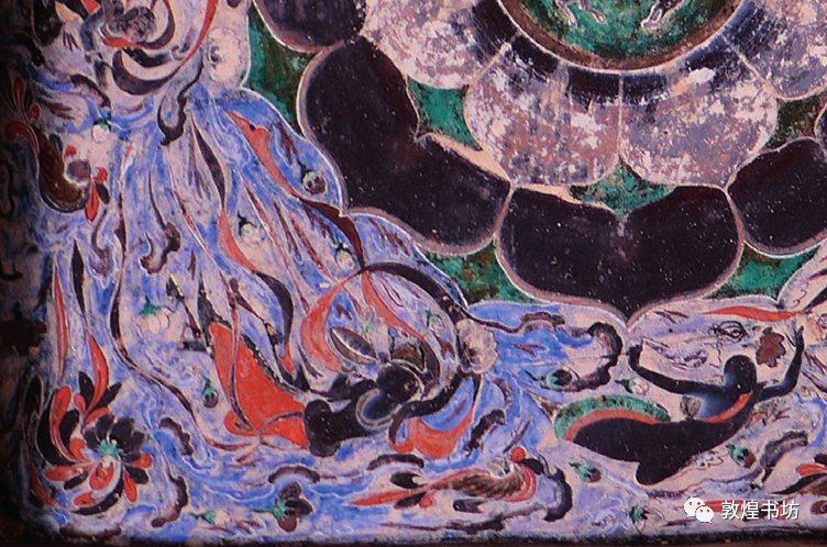 第407窟的藻井是隋代最具代表性的藻井之一,在象征天空的蓝色方井中央,绘有一朵黑红相衬,双层仰着开的八瓣大朵莲花。花瓣重叠厚重,莲花周围以蓝色为底衬,蓝底色上画8身飞天绕花飞翔。